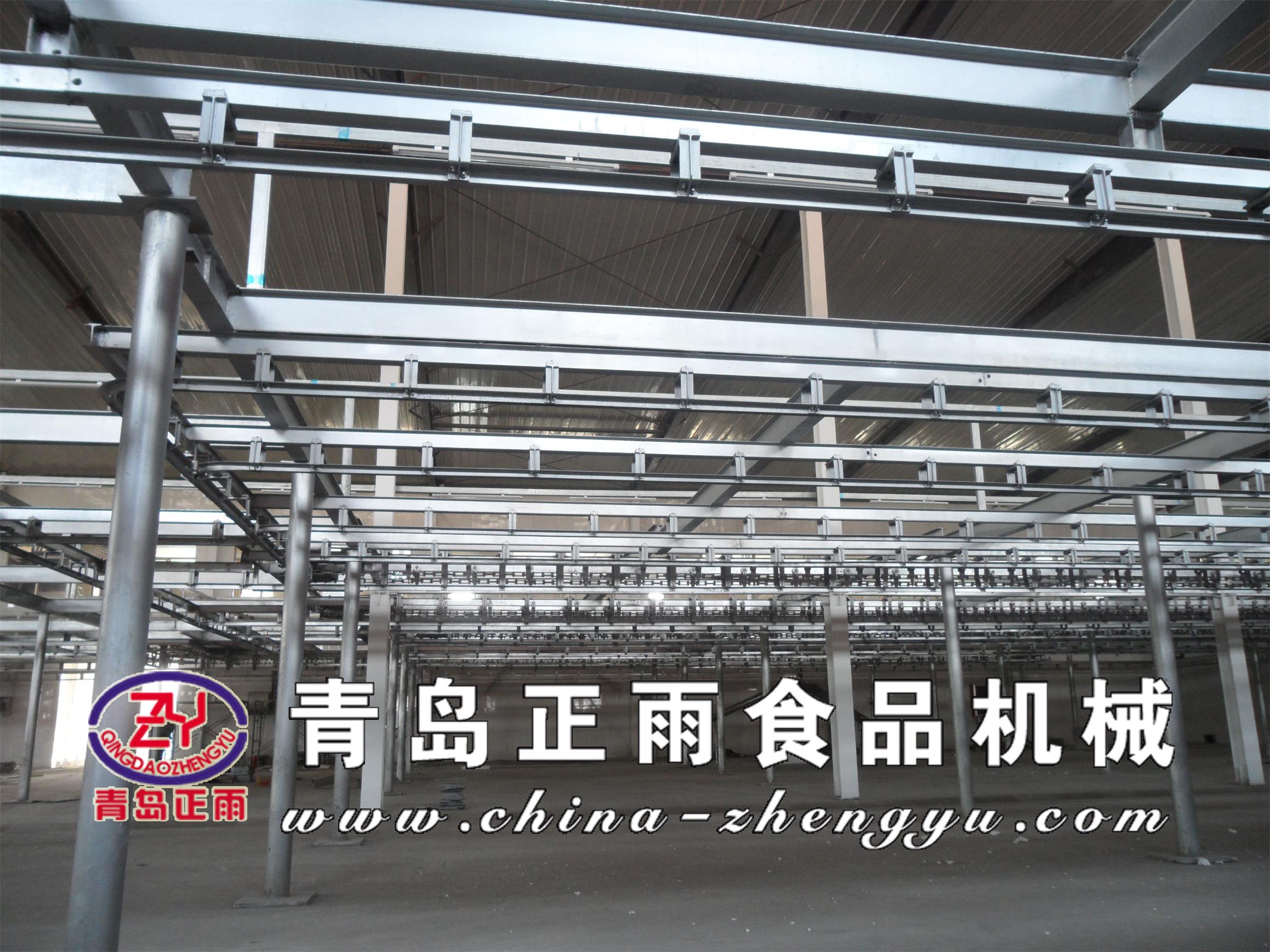 青岛正雨食品机械常年生产优质—猪羊屠宰设备双轨手推线,并提供轨道线安装服务。该屠宰专用双轨手推线是由热镀锌20#工字钢钢梁,10#工字钢轨道副梁,铸钢164轨道吊架、40*40轨道角铁,铸钢屠宰轨道道岔、弯轨、立柱等组成。主要用于生猪和羊屠宰车间,排酸间,晾肉间,分割车间,人工手推挂肉滑轮于该轨道线,轨道线安装灵活自由,亦可适用于冷藏车轨道,工艺尺寸可根据客户需求定制,全国通用。